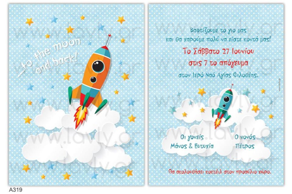 ΙΔΙΑΙΤΕΡΟ ΠΡΟΣΚΛΗΤΗΡΙΟ ΒΑΠΤΙΣΗΣ ΓΙΑ ΑΓΟΡΙ ΜΕ ΘΕΜΑ ΤΟ ΔΙΑΣΤΗΜΑ, ΜΕ ΦΑΚΕΛΟ ΣΕ ΧΡΩΜΑ ΤΗΣ ΕΠΙΛΟΓΗΣ ΣΑΣ.